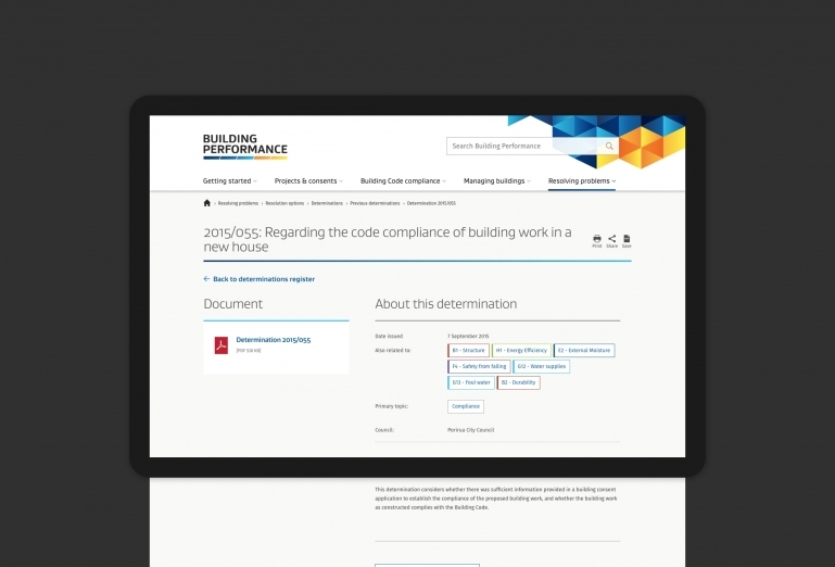 Despite construction being one of New Zealand's largest industries, homeowners and builders struggled to access information about their role and obligations under the Building Code. The Building Performance site is a vast, elegantly designed, highly-structured resource for the building sector.